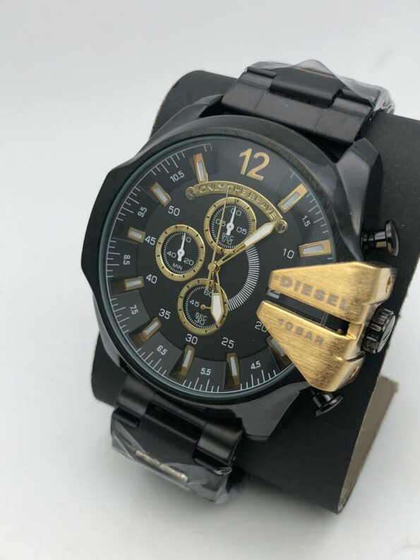 The Striking Style &, Limited Edition Colour in Diesel Mega Chief Collection Diesel 10 Bar Steel Black dial Available &, Ready to ship today Diesel For Men Model-10 Bar Feature-Working Chronograph, full stainless steel rust free black metal chain with new beautiful dial.